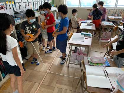 子ども達は班で協力して長さを測り、事前に自分で立てた予想と見比べていました。