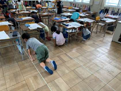 巻き尺を使って、教室の縦と横の長さを測りました。