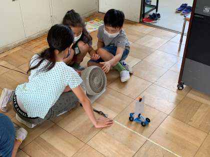 当てる風の強さによって、車の動く距離がどのように変わるか実験をしました。