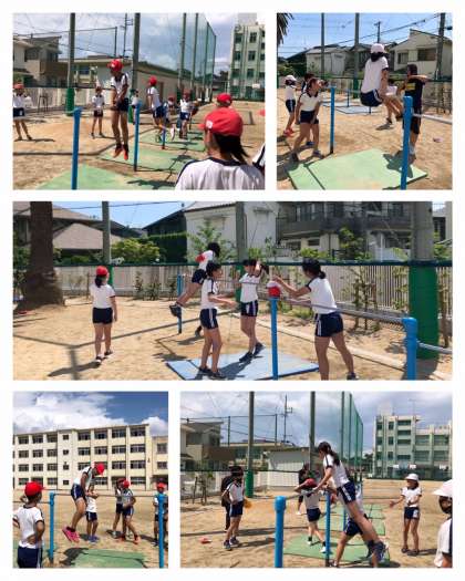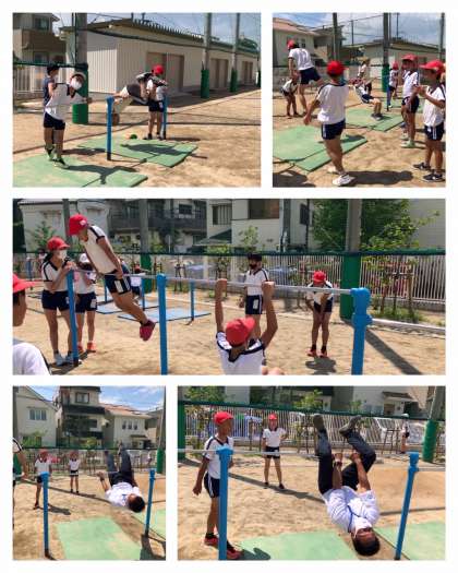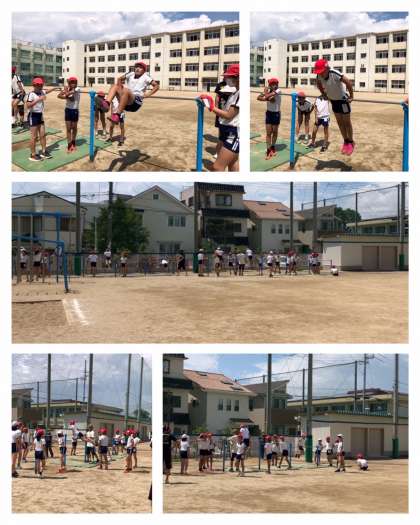 炎天下の中、6年1組が鉄棒に挑戦していました。
