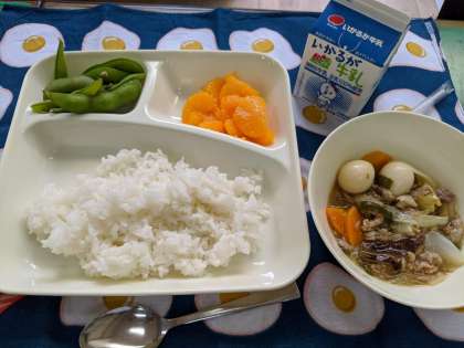 7月30日(木)のこんだては、「八宝菜、えだまめ、みかん(缶)、ごはん、牛乳」です。