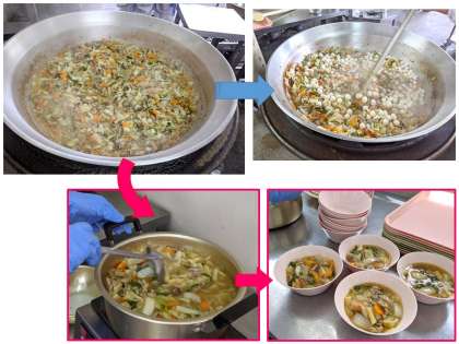 調理の途中でうずら卵を入れる前に、除去食の分を人数分取り分けておきます。教室での取り違えを防ぐため、除去食は専用のピンク色の食器に配膳しています。