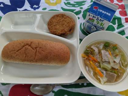 8月7日(金)のこんだては、「チキンレバーカツ、スープ、ライ麦パン、牛乳」です。