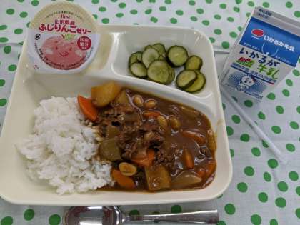 8月27日(木)のこんだては、「牛肉と大豆のカレーライス[米粉]、きゅうりのピクルス、りんごゼリー、牛乳」です。