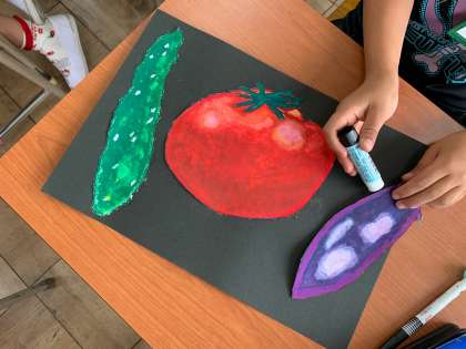 切り取った野菜の絵を、構図を考えて画用紙に貼りました。