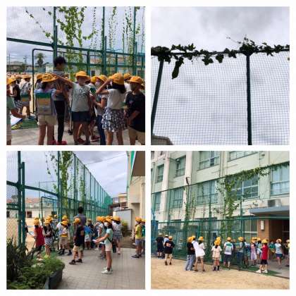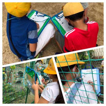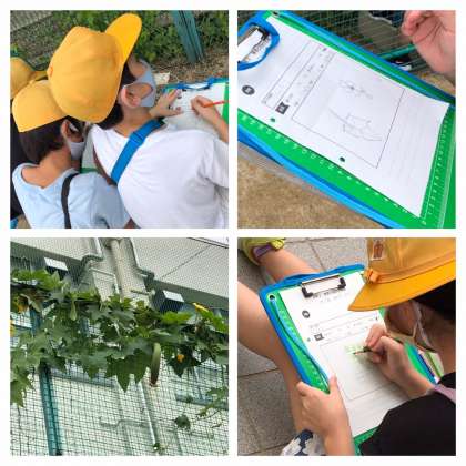 「へちま」と「ひょうたん」の観察をするはずでしたが、「ひょうたん」が残念ながら枯れてしまったようです。ていねいに葉っぱの様子をスケッチ、あさがおの葉ととの違いも観察しています。