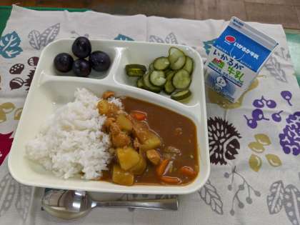 9月10日(木)のこんだては、「チキンカレーライス(米粉)、きゅうりのピクルス、ぶどう(巨峰)、牛乳」です。