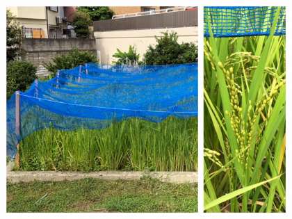 5年生が植えた稲、稲穂が膨らみ始めています。すずめや鳥につつかれないように防護ネットを張りました。