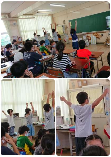 教室でしていたラジオ体操は、4人ずつ前に出て演技していました。細かい動きに注意して真剣に取り組んでいました。