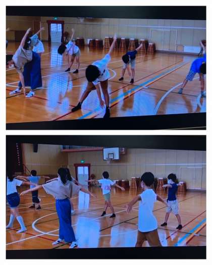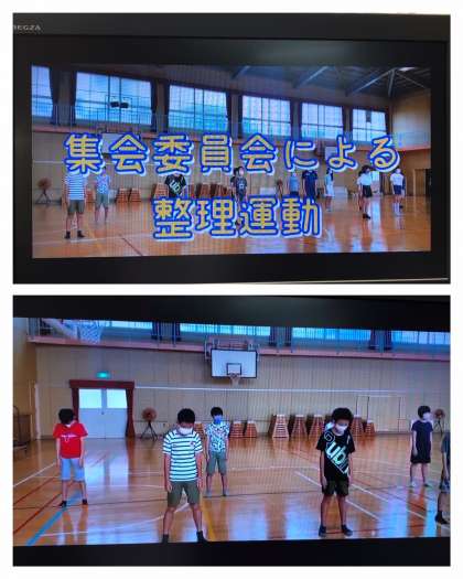 集会委員会による整理運動の模範演技が披露されました。ゆっくり呼吸をしながら、体の疲れをほぐします。