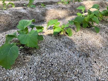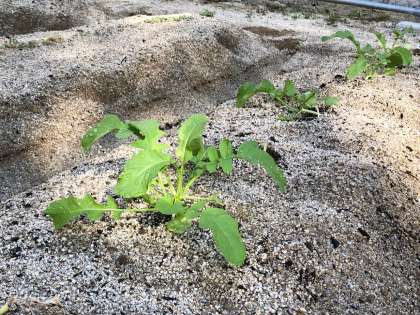 くすのき広場の畑に植えているなにわの伝統野菜(写真上:天王寺蕪 写真下:田辺大根)、順調に生育しています。