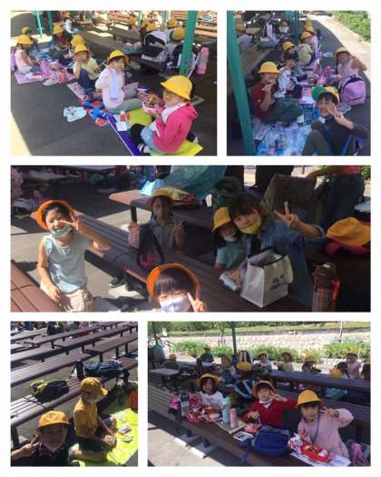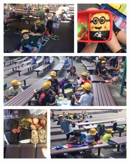 ベンチに座ったり、シートを広げたり、グループになって楽しそうにお弁当を広げます。写真の中には、校長先生のお弁当も写ってます。