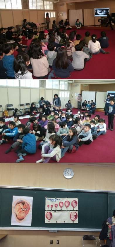 はじめに、赤ちゃんが産まれるまでを、映像や掲示物を使って