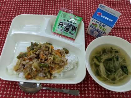 10月8日(木)のこんだては「ピリ辛丼、中華スープ、ソフト黒豆、牛乳」です。