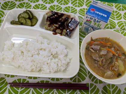 10月14日(水)のこんだては「お好み焼き、豚汁、きゅうりの梅風味、ごはん、牛乳」です。