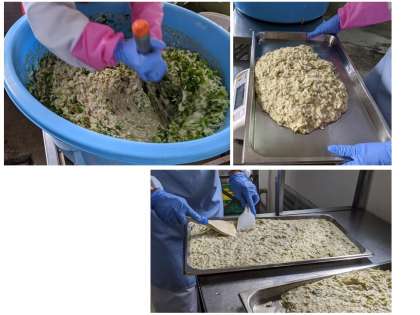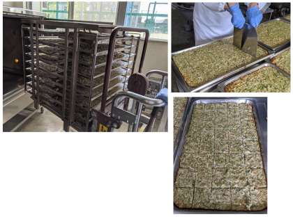 お好み焼きは、小麦粉、卵、やまいもとろろ、かつおぶし粉、青のり、みじん切りにしたキャベツと青ネギを合わせて生地をつくります。生地を40人分ずつ鉄板に入れてオーブンで焼いた後、切り分けて配缶します。教室で食べるときに自分でソースをかけます。