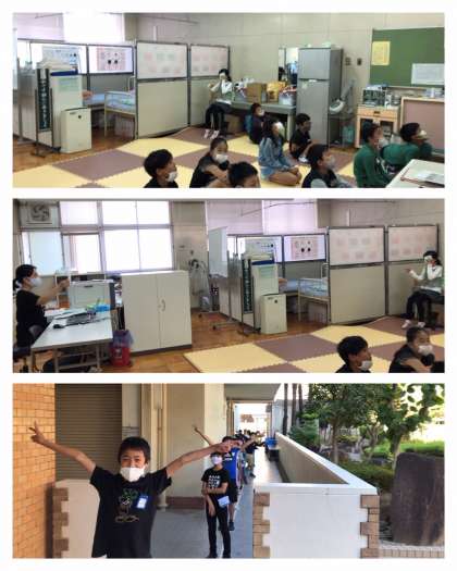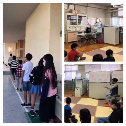 保健室で、アルファベットの「C」のようなマーク(ランドルト環)を使っての視力検査です。待機者は、きっちりソーシャルディスタンスを守っています。