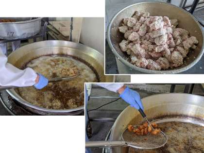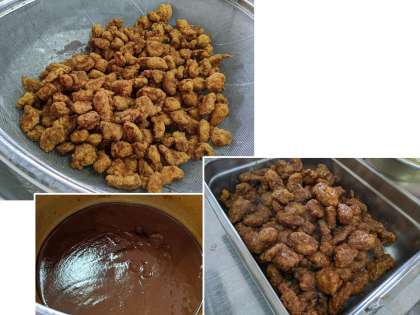 一口大の豚肉にひとつずつパン粉をつけて大きな釜で揚げていきます。中心まで加熱されているかどうか温度を測って確かめます。からりと揚がったカツに、八丁味噌を使ったみそだれをからめています。