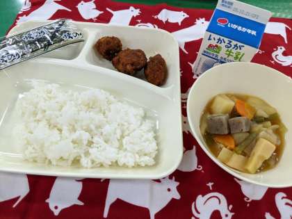10月15日(木)のこんだては「みそカツ、じゃがいもと野菜の煮もの、焼きのり、ごはん、牛乳」です。
