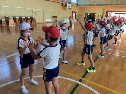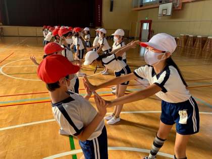 明日の遠足で、お弁当を食べるときの密にならない集まり方を考えました。