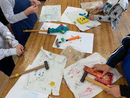先日取り組んだ、木材とくぎを使った工作の様子です。