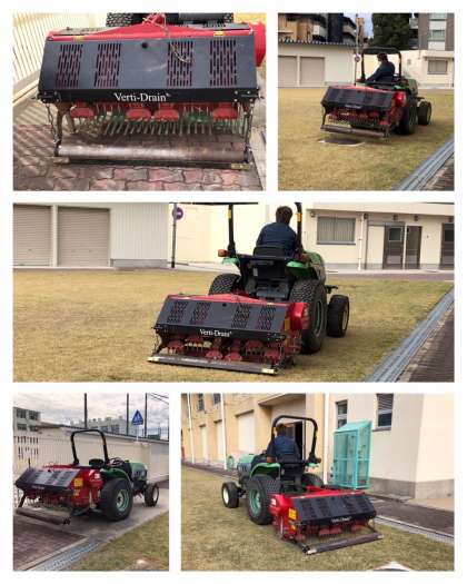 大きなトラクターで、芝生の土壌に穴をあけるエアレーションをします。
