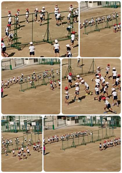 1年生は外で体育をしていました。玉入れの玉を使って、高く遠くに投げる練習をしていました。