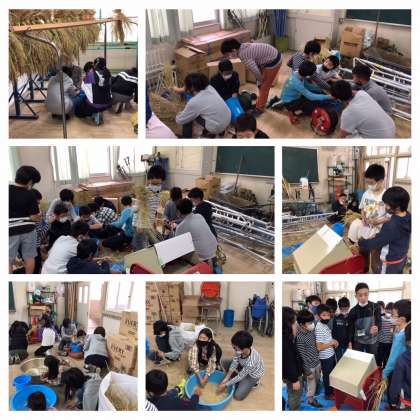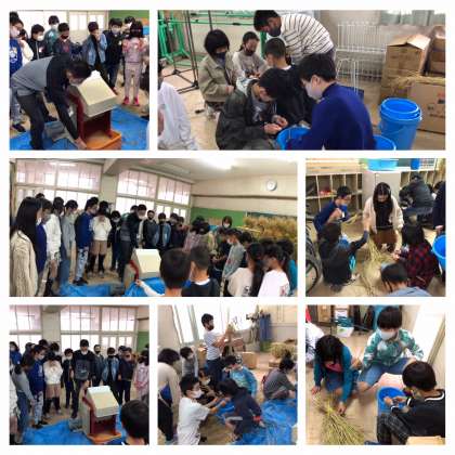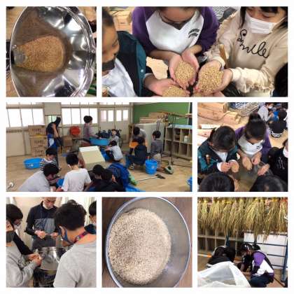 11月2日(月)、天候不良のため今日の遠足は延期になりましたが、お米づくりの最終段階である脱穀・精米に取り組みました。
