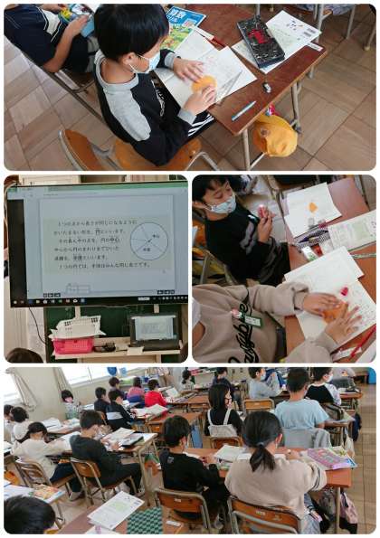 2時間目、3年生は算数で、コンパスを使って円の学習をしていました。直径や半径の性質も調べています。コンパスの使い方も練習しました。