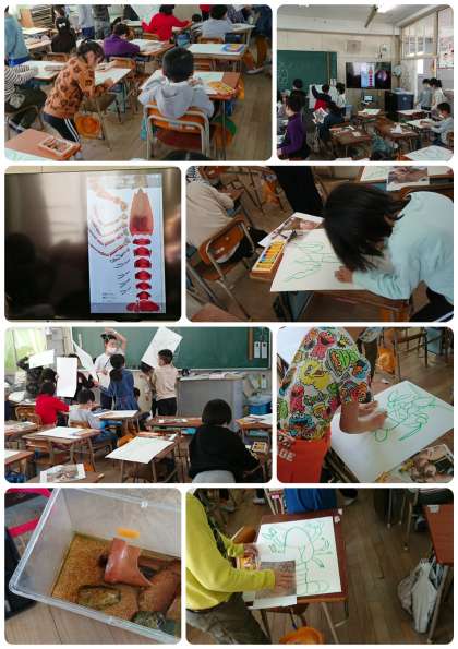 2年生は、図画工作でザリガニの絵を描いていました。教室で育てているザリガニをよく観察して、丁寧に画用紙いっぱいに描いていました。出来上がりが楽しみです。