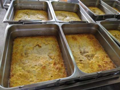 ツナポテトオムレツは、卵、じゃがいも、ツナを1クラス分ずつバットに入れて、溶かしバターをかけて焼きます。おいしそうな焼き色がついて、きれいに出来上がりました。教室でケチャップをかけて食べます。