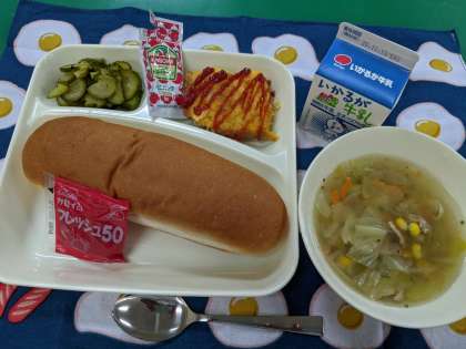 11月9日(月)のこんだては「ツナポテトオムレツ、スープ、きゅうりのバジル風味サラダ、コッペパン、いちごジャム、牛乳」です。