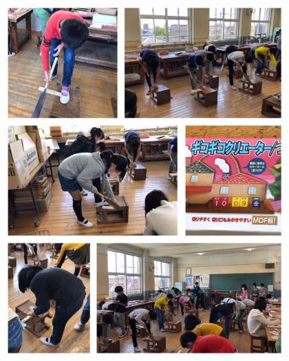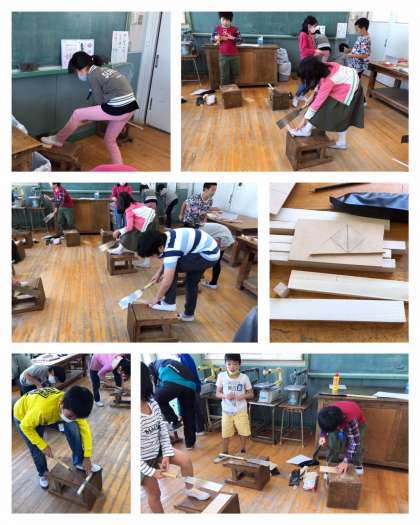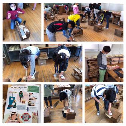 のこぎりの扱いが難しそう。どうすれば上手に切れるのか、工夫しながら慎重に取り組んでいます。どんな作品が出来上がるのか楽しみです。