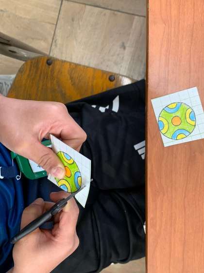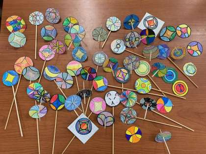 算数でこま作りに取り組み、コンパスで模様を描きました。
