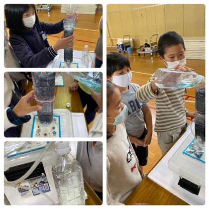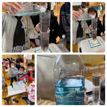 色をつけた水を砂や粒状活性炭に通すと、においも色もきれいな水になって出てきました。