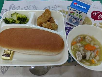 11月16日(月)のこんだては「白身魚のフリッター、洋風煮、ブロッコリーのサラダ、コッペパン、バター、牛乳」です。