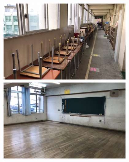 3連休の間に改修工事を行うために、11月20日放課後に教室内の机、椅子を廊下に出しました。