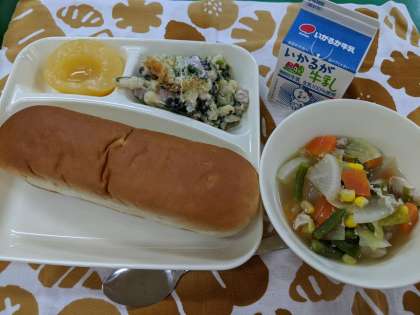 11月24日(火)のこんだては「スープ煮、ほうれんそうのグラタン、白桃(缶)、おさつパン、牛乳」です。