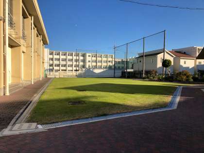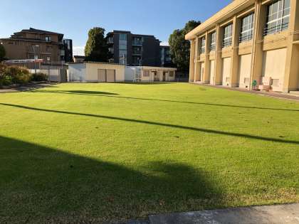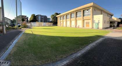 オーバーシード(夏芝が枯れたところへ冬芝の種をまくこと)中でした芝生広場。