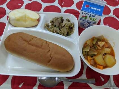 11月26日(木)のこんだては「豚肉のカレー風味焼き、ケチャップ煮、りんご、黒糖パン、牛乳」です。