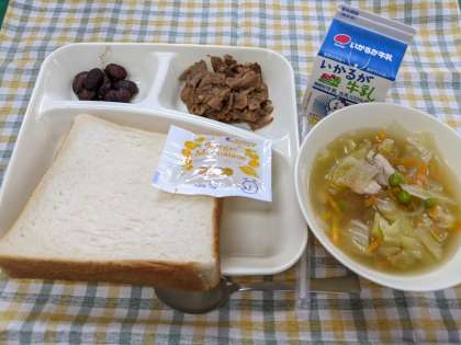 11月30日(月)のこんだては「豚肉のデミグラスソース、スープ、うずら豆のグラッセ、食パン、マーマレード、牛乳」です。