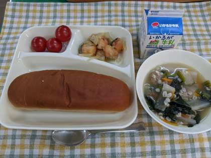 12月10日(木)のこんだては「さけのマリネ、肉だんごと麦のスープ、プチトマト、黒糖パン、牛乳」です。