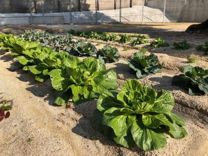 手前から、はくさい、キャベツ、ブロッコリー、にんじん、だいこんが育っています。