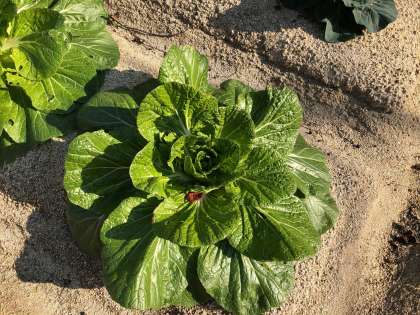 この時期には、結球して白菜の形になってるはずですが、ご覧のように葉が広がったままです。植え付けの時期、肥料、気温など様々な環境が影響したようです。