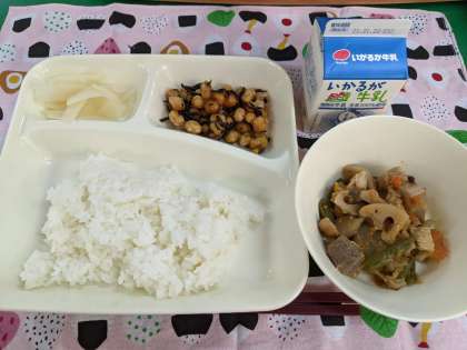 1月18日(月)のこんだては「筑前煮、ひじき豆、だいこんのゆず風味、ごはん、牛乳」です。