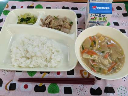 1月19日(火)のこんだては「豚肉のごまだれ焼き、みそ汁、きくなとはくさいのおひたし、ごはん、牛乳」です。
