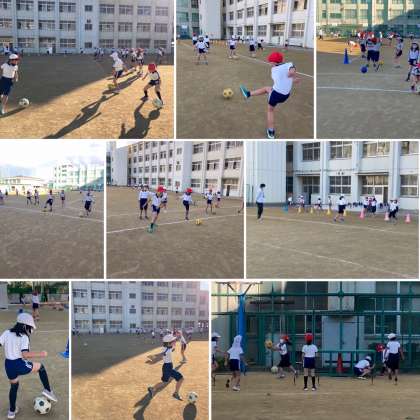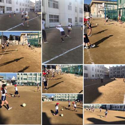運動場での体育は、「ボール蹴り遊び」をしています。