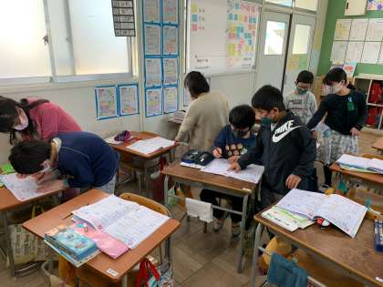 子ども達は、「ここ計算間違えてるけど、やり方分かる?」「ここは途中の式を書こう。」と、友達のドリルをよく見て優しく正確なアドバイスをすることができました。