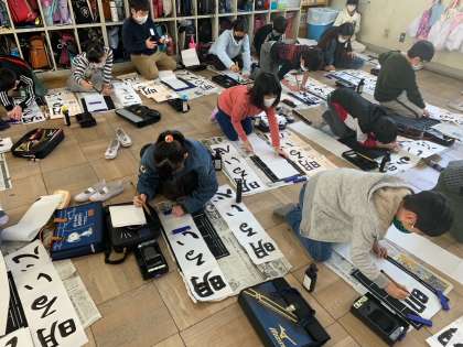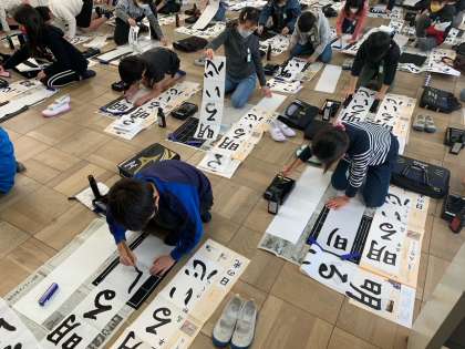 長い紙も床での毛筆も初めての子ども達は、周りの様子を見ながら慎重に書き始めていました。