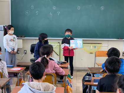 話し合いで班の代表になった児童が、くじ引きで決まった別の班の代表児童と本の紹介対決を行います。